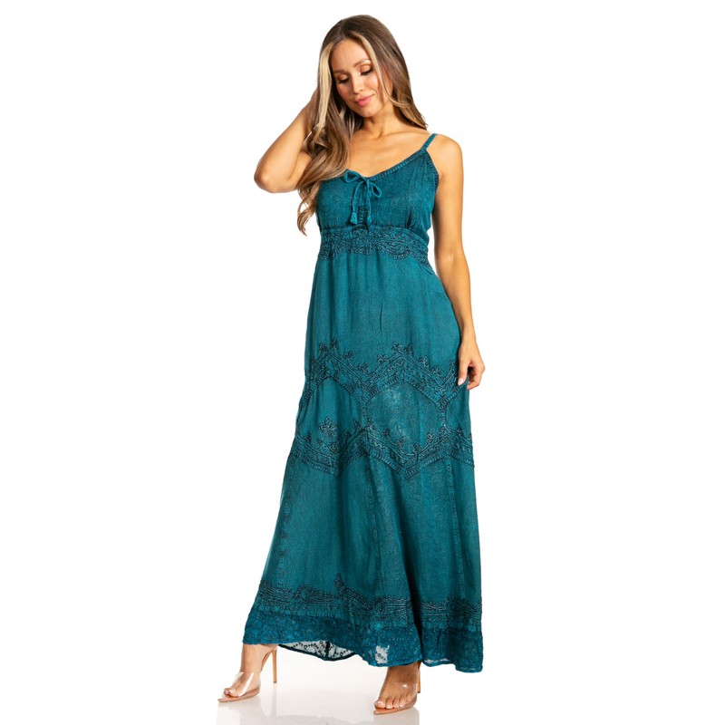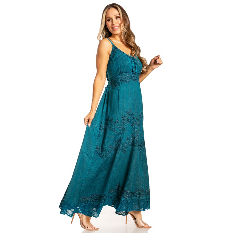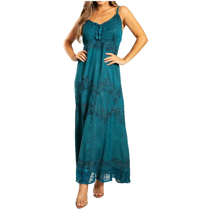 Sakkas Stonewashed Rayon Embroidered Adjustable Spaghetti Straps Long Dress - Steel Blue - 1X/2X