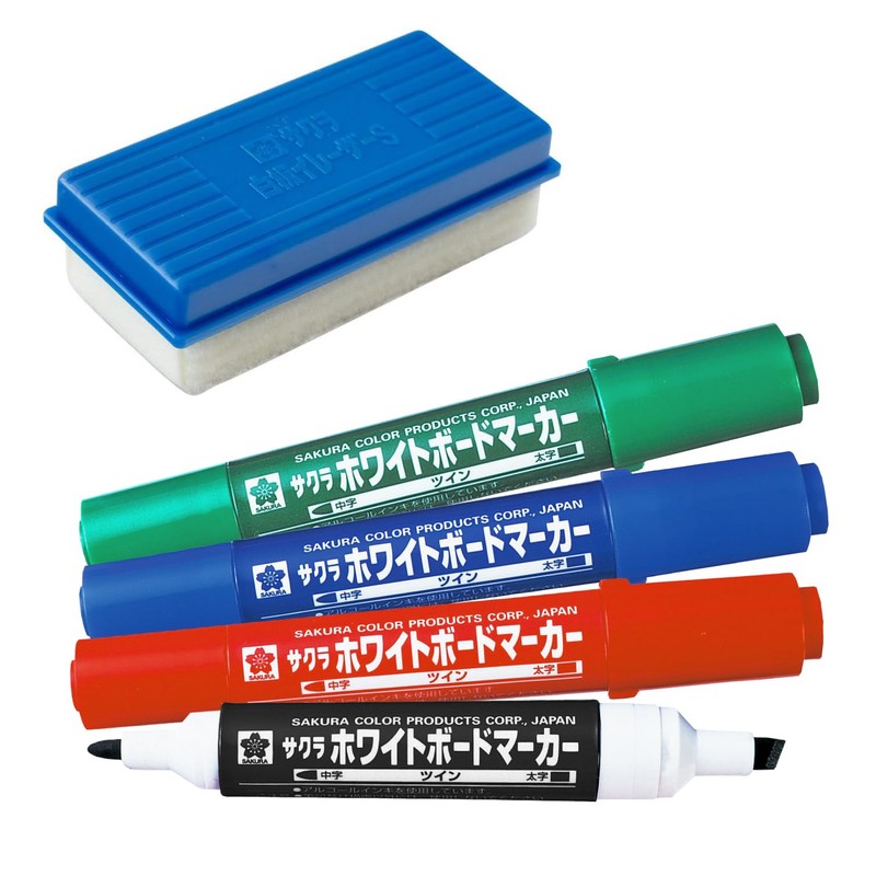 Sakura Crepas Whiteboard Markers, Twin, Round and Square Leads, 4 Colors + Eraser Set WBKT4ES
