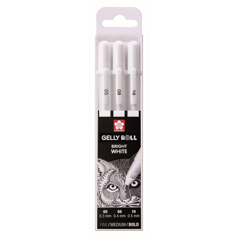 • Gelly Roll Fine, Medium and Bold No. 05, 08 and 10. Set of 3 with brilliant white tone.