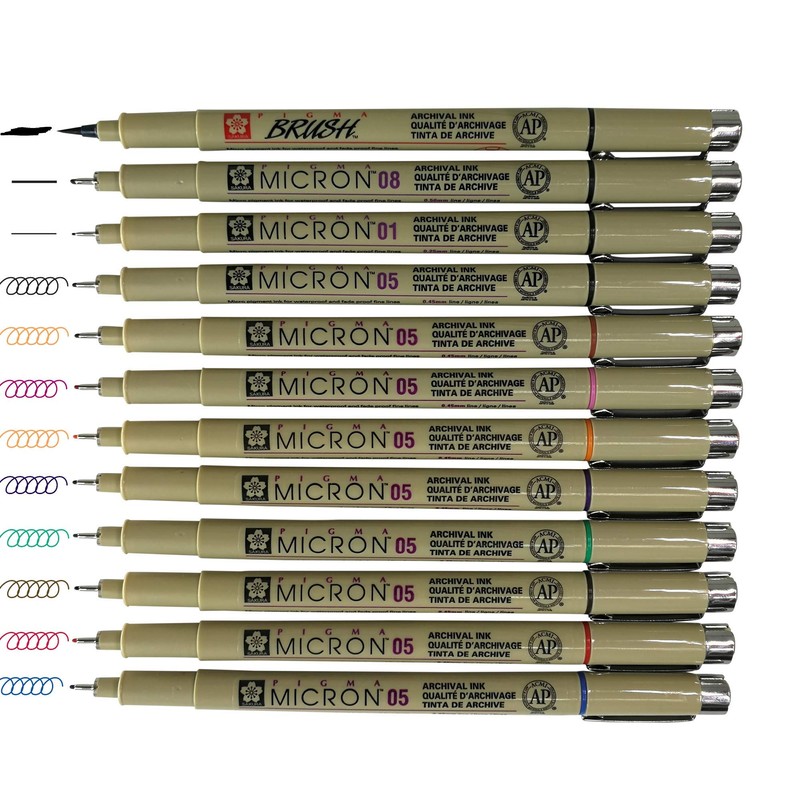 - Full Professional Pigma micron 12 piece fine point set : 9 colors (Size 05) with Black (01 - 0.45mm, 08 - 0.50mm, Brush - Flexible)