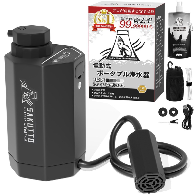 - SAKUTTO Portable Electric Water Purifier has sold 100,000 pieces. The SAKUTTO brand introduces an electric handheld water purifier. Compared to manual portable water purifiers, you can ensure a high speed and clean drinking water. The special structure inside the main unit thoroughly removes bacteria such as E. coli, chrella and other prosomal cysts, and the high performance activated carbon filter effectively removes odors such as calci, and the taste of water and improves the taste and odor. The SAKUTTO electric water purifier boasts high water purification that can be used to filter river water, ponds or mud water in emergencies such as disaster or water outage, and can be used to clean drinking water without worry. The Makuake site has been evaluated for high functionality and design and earned more than 140% of the goal amount