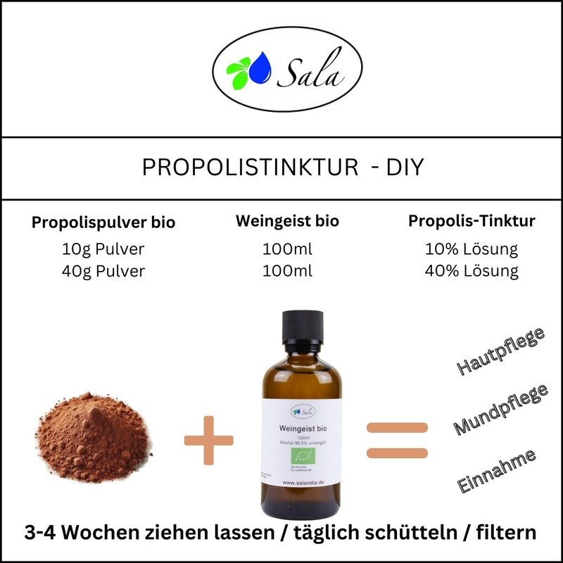 Ist ein feines, hellbraunes Propolispulver aus gereinigtem Propolisharz ohne Wachsanteil in Bio-Qualität. Das natürliche Propolis enthält u.a. ätherische Bestandteile, Mineralstoffe, Spurenelemente und Vitamine. Das Propolispulver kann als Zusatz in Kosmetikprodukten (z.B. Salbe, Seife, Lippenpflege) oder zur Herstellung einer Propolistinktur verwendet werden. Ebenfalls findet es Anwendung als Nahrungsergänzungsmittel z.B. im Müsli, Smoothie, Saft oder mit Honig gemischt. Weitere medizinische Informationen sind der Fachliteratur oder dem Internet zu entnehmen.