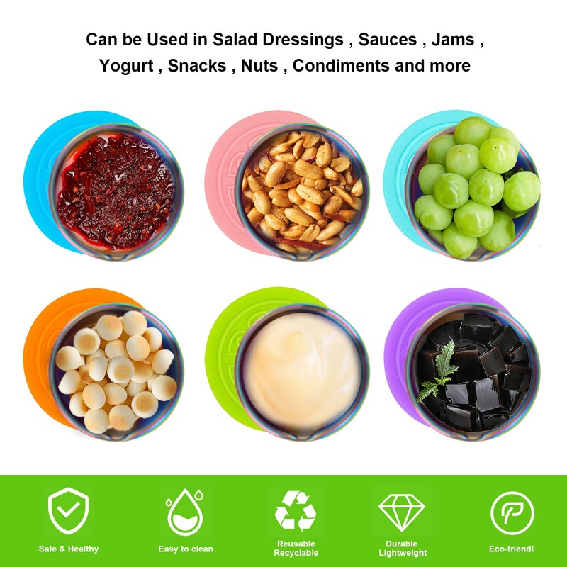 Salad Dressing Container to Go, 6x1.6 oz Reusable Small Containers with Lids, Rainbow Sauce Containers for Lunch Box, 18/8 Stainless Steel Condiment Cup, Easy Open, Leakproof Dipping Sauce Cups