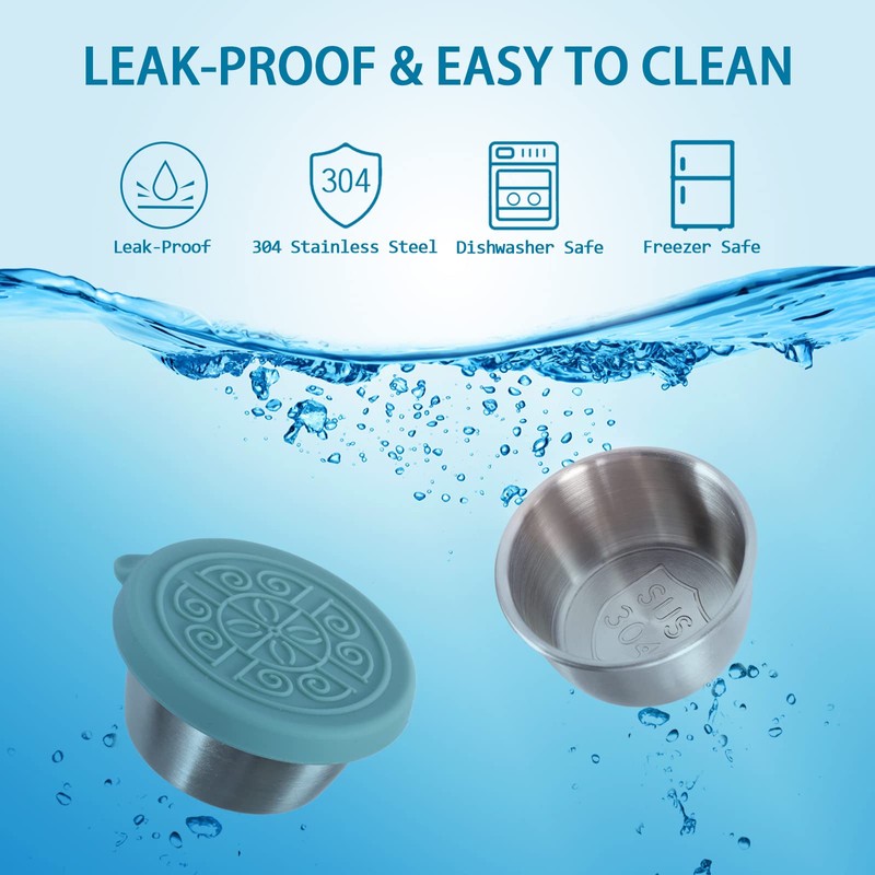 - 【Food-grade & Eco-friend】Reusable sauce cups with lids are made of food-grade silicone and premium 304 stainless steel, BPA-free, freezer safe. This dressing container is reusable, and beneficial in reducing the use of disposable condiment cups, reducing waste and protecting the environment while saving your money.