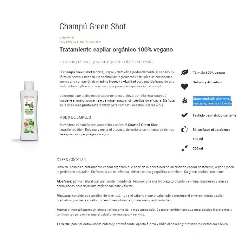 - Tipos de cuidado del cabello: Hidratación,Fórmula 100% vegana,Green cocktail: aloe vera,manzana,menta y té verde,Sin sulfatos ni parabenos