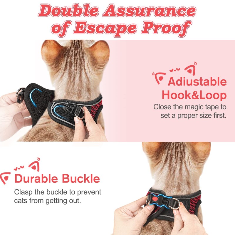 - Easy to Wear: Step in, clip and go. The mesh cat harness is easy to put on and off in seconds with its magic tape on the back. The locking function on the strong buckle that ensures no accidental detachment. The adjustable strap gives the best fit for every cat