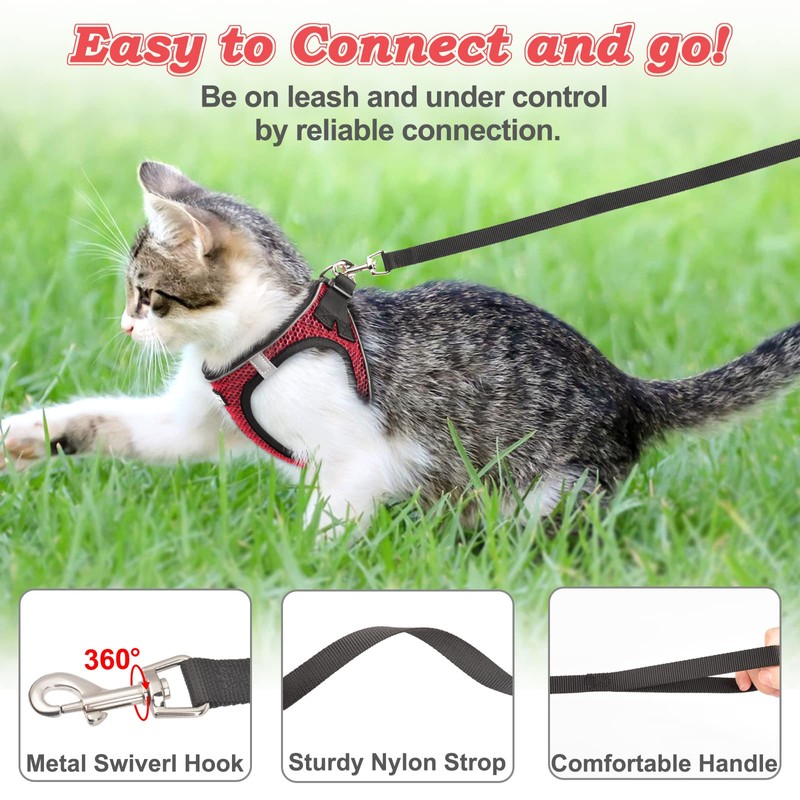- Escape Proof Cat Harness: The cat harness have quick snap clip, double stitched around a reinforced anchor hook, 2 sturdy D-Ring for leash attachment. The adjustable Velcro allow you customize the vest to your cat's tiny frame, so that cat won't slip out easily or even get lost during outdoor adventures