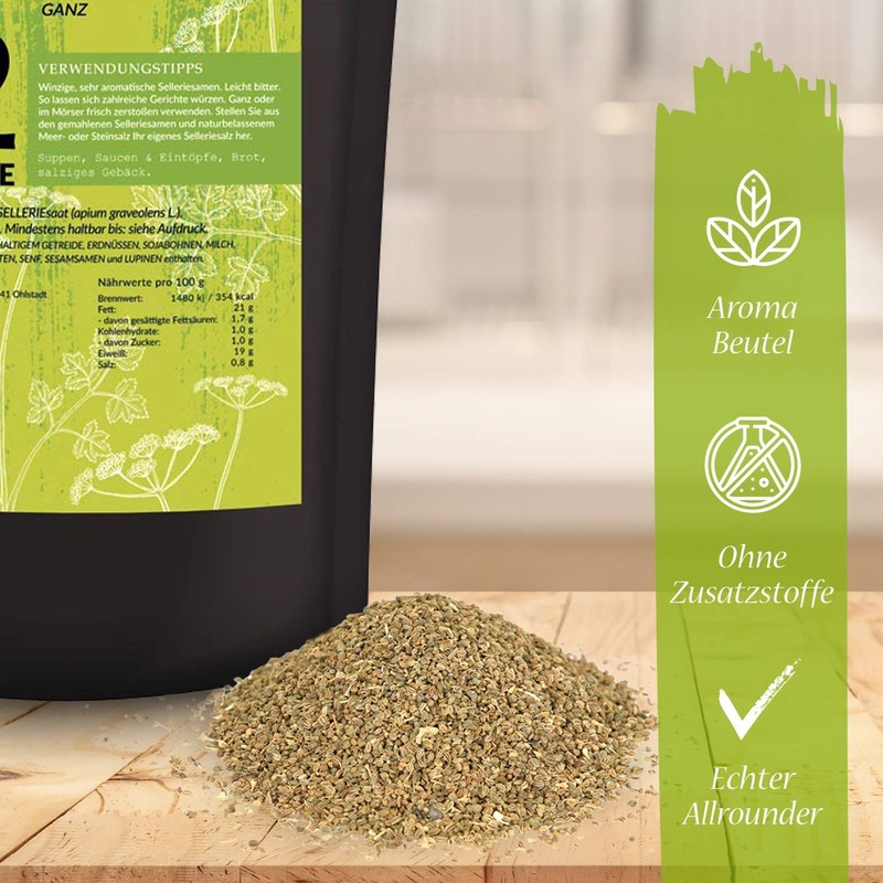 - Product safety: so that you have something of your celery seeds for a long time, the seeds are delivered in a practical resealable aroma bag. The bag ensures that no moisture or liquid gets to the seeds. This keeps the quality and taste for a long time.
