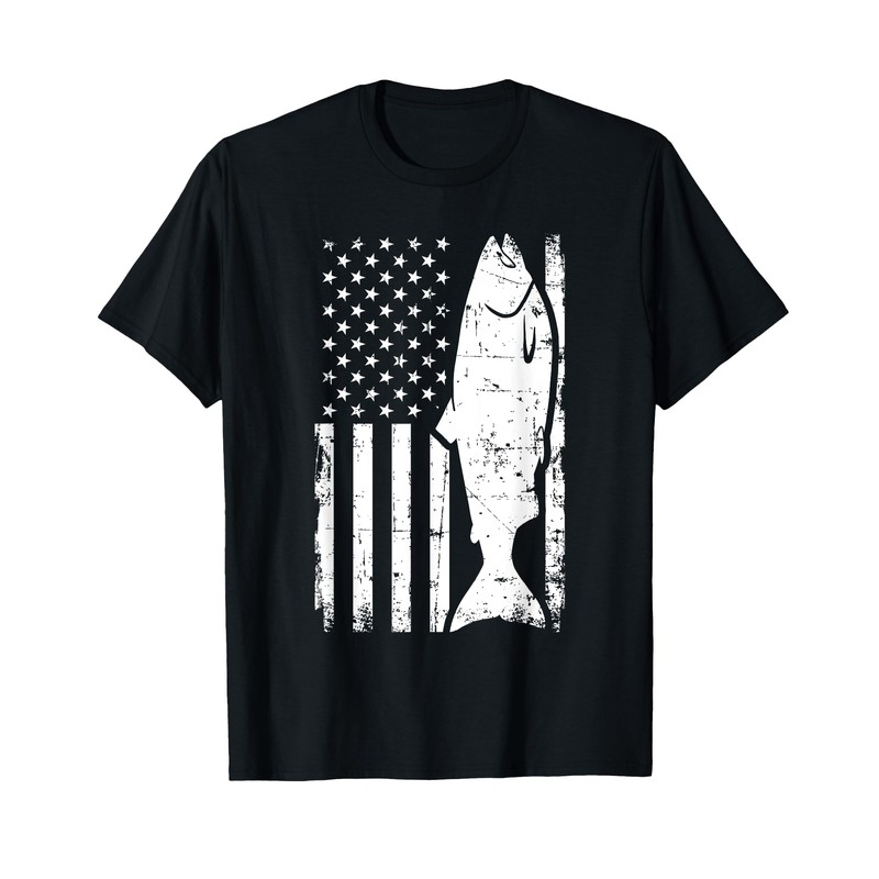 - Salmon with USA or US flag for fishers and anglers enjoying their time and hobby in the nature while they go fishing with their rod, line, bait and hook in the water or lake or river with their friends in the summer.