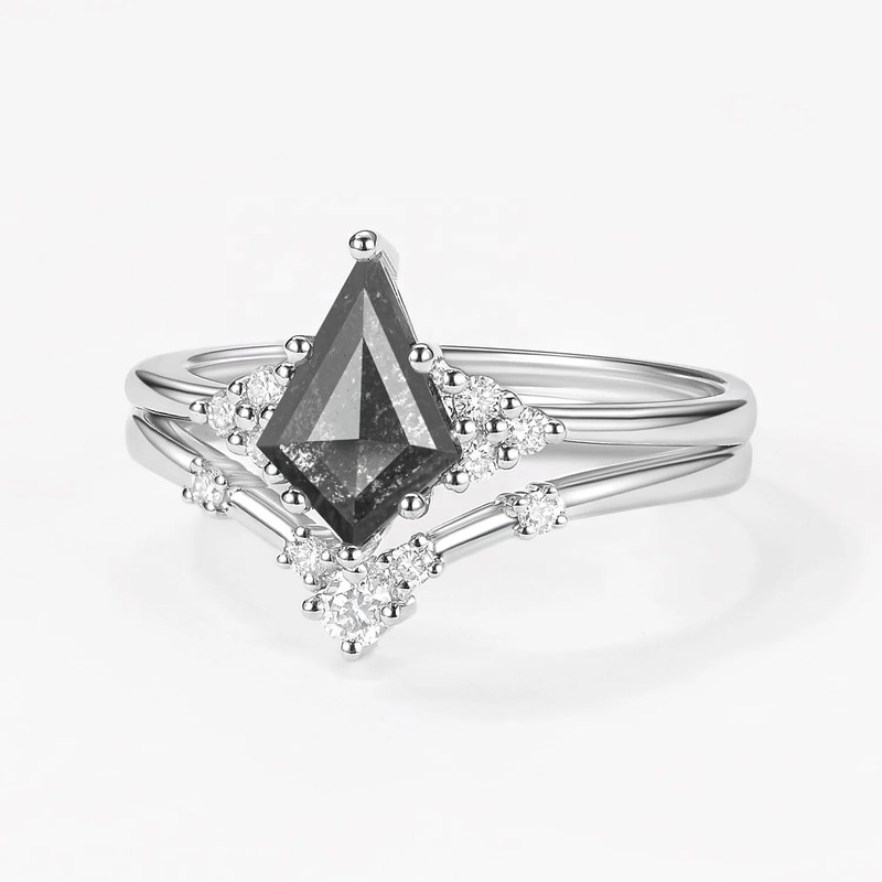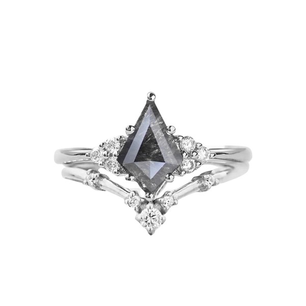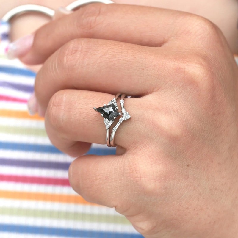 - Kite Cut Salt and Pepper Stackable ring: Showcasing an abstract arrowhead pattern, this ring boasts a kite cut gemstone at its center, enhanced by multiple round stones along the lower band. The exquisite design and prong setting deliver classic brilliance and make it the best Christmas gift or wedding gift for any jewelry lover.