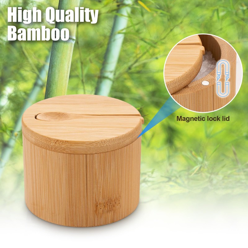 Salt Container Set of 2 - Round Bamboo Salt Cellar & Spice Box with Spoon,Magnetic Swivel Lids for Easy Access,Ideal Spice Box for Salt,Pepper,Sugar,Seasonings - Kitchen Essential Storage Solution