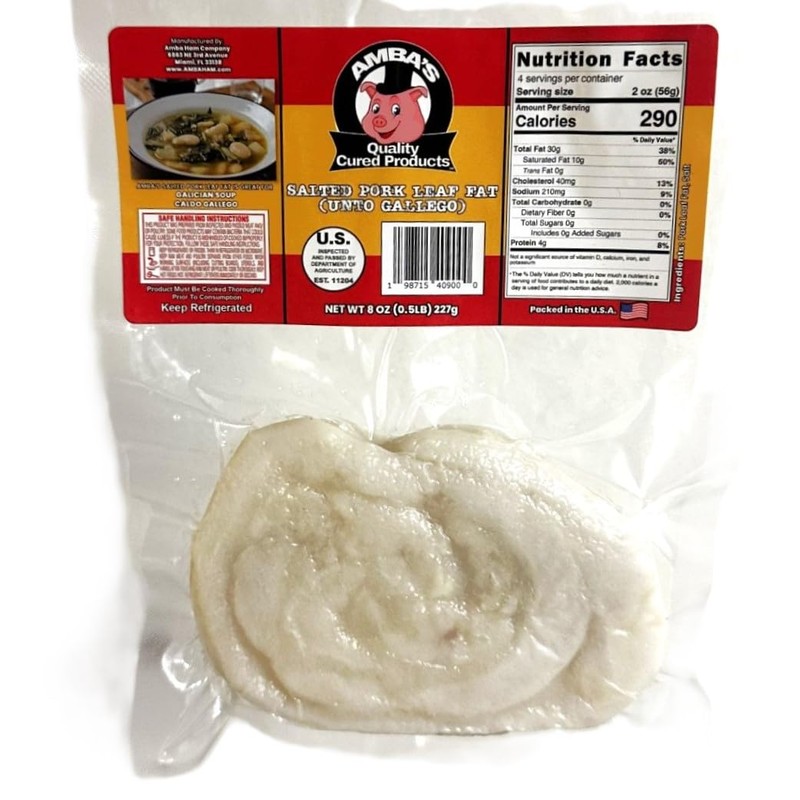 Salted Pork Leaf Fat, (Unto), Used As Flavoring For Galician Soup Recipe. Unto Gallego Para Saborizar El Caldo Gallego. Net Weight 8 oz (0.5 lb) Vacuum Sealed Bag. Amba's Quality Cured Products