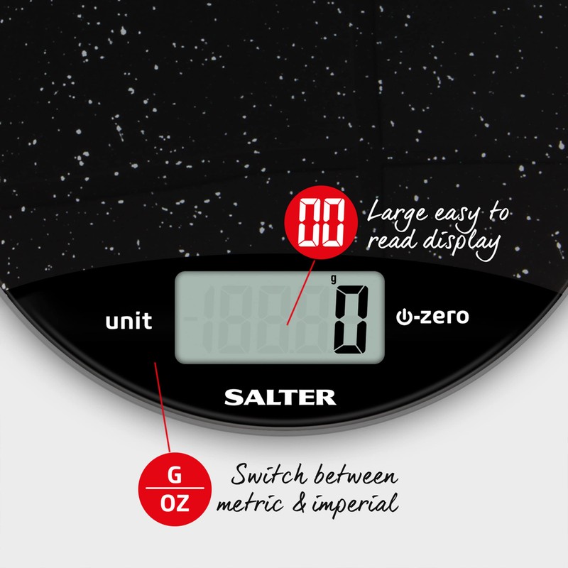 - Elegantly designed with a stunning marble finish, the glass Black Marble Electronic Kitchen Scale from Salter provides accurate readings