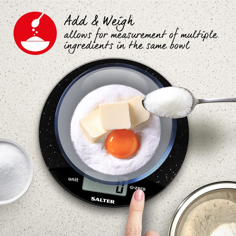 - Featuring an add , weigh function, you can add multiple ingredients in the same bowl when baking up to 8 Kg, saving time on washing up