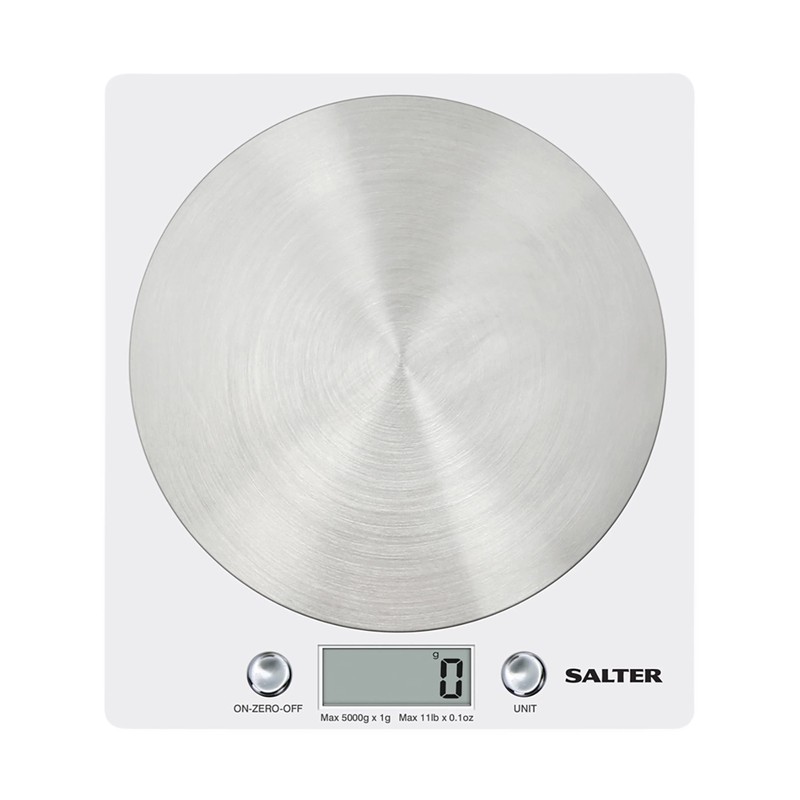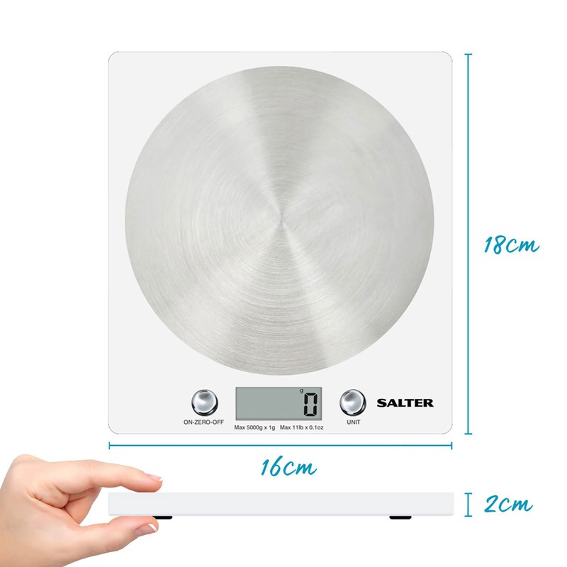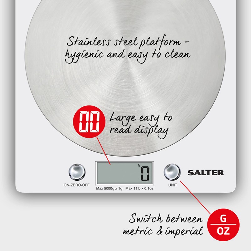 Salter 1036 WHSSDR Disc Electronic Scale - Digital Weighing, Stylish Slim Design, Home/Kitchen Cooking, Spun Stainless Steel Platform, Add & Weigh, Measures Liquids/Fluids, 5 Kg Capacity, White/Chrome