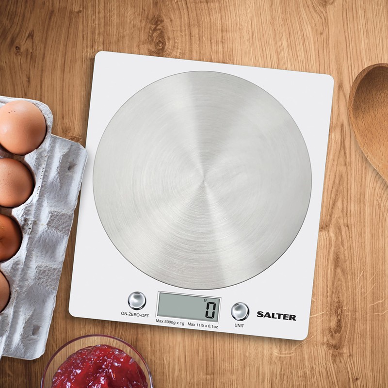 - Effortlessly weigh out your favourite baking ingredients with the Disc Electronic Scale from Salter, perfect for any kitchen collection