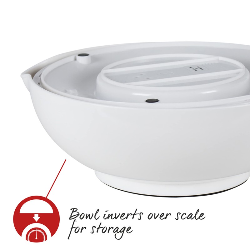 • If you’re short on kitchen space, the bowl inverts over the scale to ensure space saving, neat and dust-free storage after use