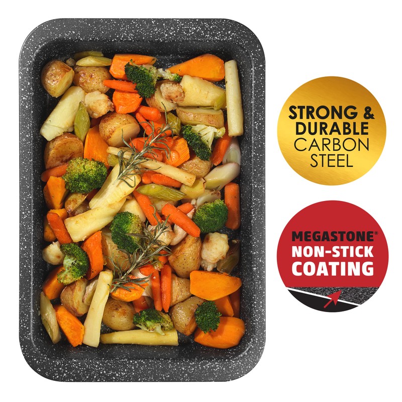 - This Megastone pan makes healthier roasts for your family with a PFOA-free coating, offering ultra non-stick performance with less oil.