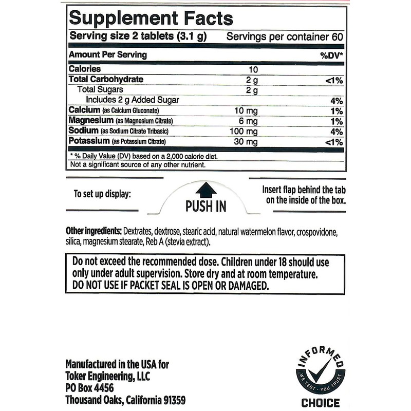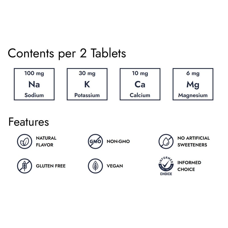 - Suggested use: 2 tablets per 15-30 minutes during activity, each tablet contains 50mg sodium, 15mg potassium, 3mg magnesium, similar to what the body loses through sweat.