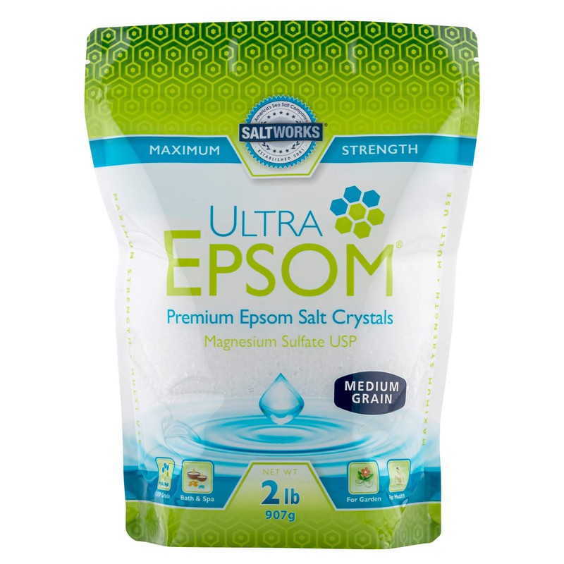 Ultra Epsom Salt is the highest quality, pharmaceutical grade Epsom salt available. Ultra Epsom Salt brand of magnesium sulfate, exclusively from SaltWorks, is known for its exceptional purity and therapeutic value. It dissolves easily, perfect for soothing sore muscles, relaxing soaks, and calming foot baths. Create body scrubs, bath salts and much more with the new range of grain sizes available. Add Ultra Epsom Salt to your garden for lush, green lawns, roses and vegetables. Ultra Epsom Salt is affordably priced and offered in bulk in several unique grain sizes for multi-purpose use. Medium Grain: Ultra Epsom in Medium grain is a crystal size that works well for bath salts, body scrubs, sore muscle soaks and in gardening. Praised for its unrivaled therapeutic and calming properties, Ultra Epsom Salt is the highest quality, pharmaceutical grade magnesium sulfate on the market. Because it dissolves quickly and easily, this restorative muscle relief bath salt is the perfect companion for any relaxing night in. Sold exclusively by SaltWorks, Ultra Epsom works wonders to alleviate even the worst stress, muscle soreness, Athlete's foot, and even chronic pain. Create luxurious body wash, scrubs and exfoliators, bath bombs, facial cleansers - even bubble bath - with the most potent magnesium sulfate available. A small sprinkle of Ultra Epsom can even help nourish your flowers, houseplants, zen garden, and lawn.