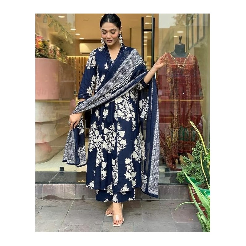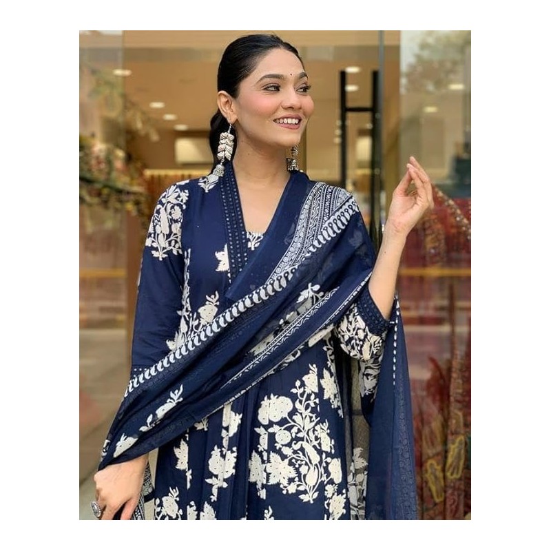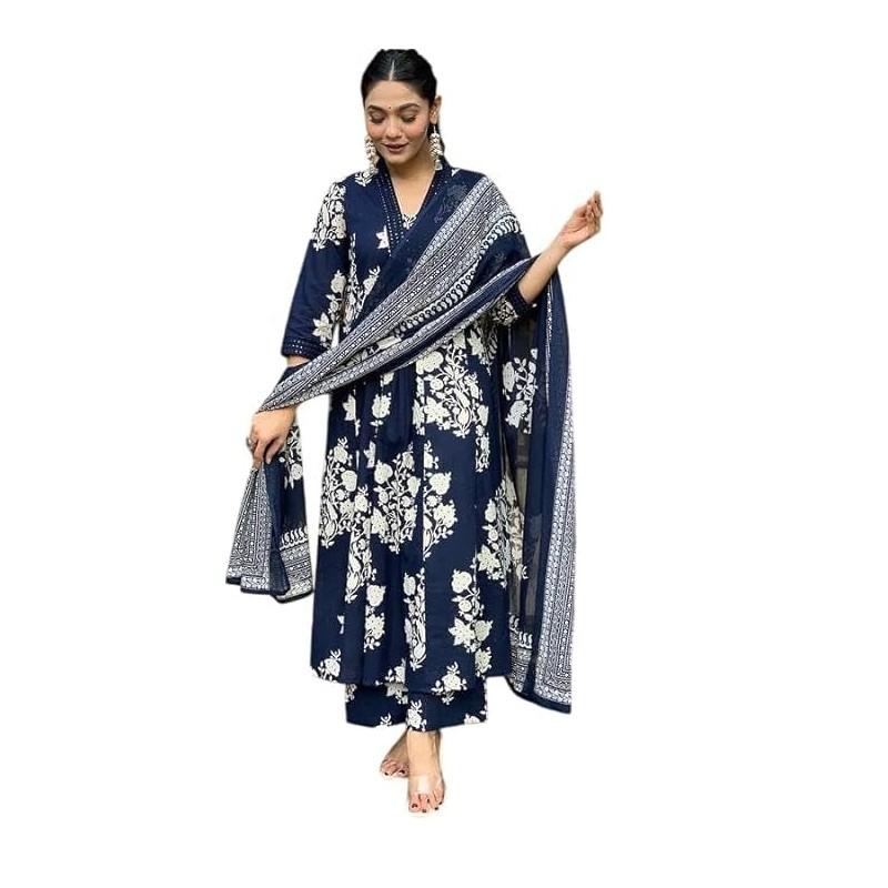 Sambhav Quilt Hub Womens Rayon Blend Anarkali Printed Kurta with Palazzo & Dupatta Festive Wedding Party Kurta Set (US, Alpha, Small, Regular, Regular, Blue)