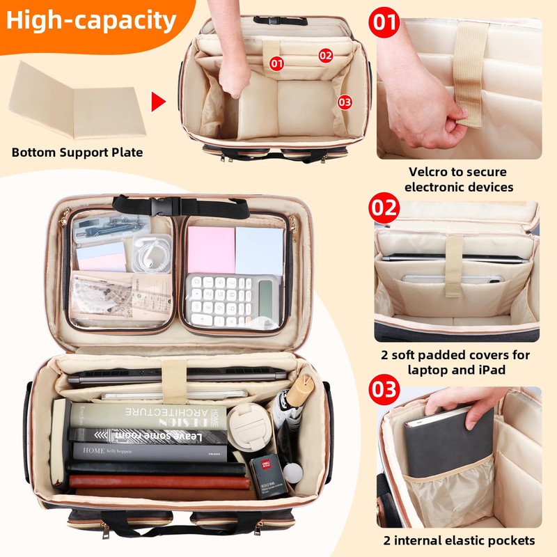 - Spacious Laptop CompartmentThis rolling teacher bag with laptop compartment can accommodate folders, an iPad and 15.6 inch laptop in the padded sleeves with velcro. A thick bottom padding pad of teacher rolling laptop bag provides base support, keeping your laptop, research papers and books secured.
