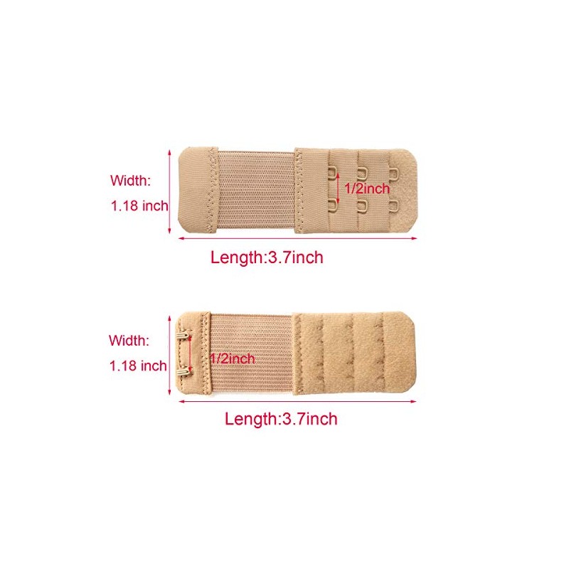 • Women's 2 hooks bra extender size (L x W)}: 3.7 inches x 1.18 inches, with a distance of 1/2 inch between the hook centers. This bra extender has 3 rows of position hooks. With 2 x 3 hooks, you can easily adjust your bras.