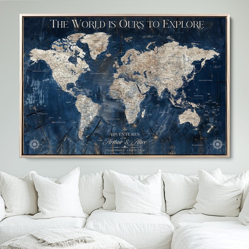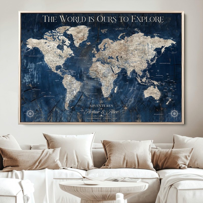 - Customizable Adventure Map: This black and white push pin world map canvas features the quote "To a Lifetime of Adventures" and can be personalized with names or messages for couples, families, or newlyweds. Perfect for marking milestones and celebrating shared journeys in a meaningful way.