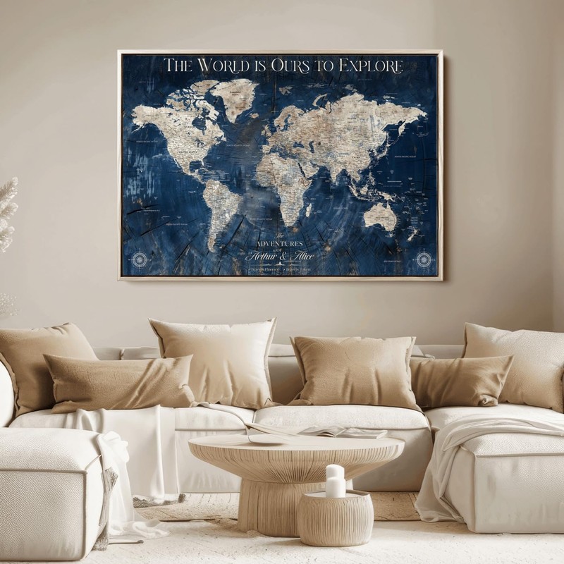 Crafted on museum-quality canvas using UV-resistant inks, this piece offers both durability and high-definition detail. Unlike generic prints, your names are elegantly incorporated into the design, creating a keepsake that captures the essence of your shared travels, love story, or future plans.
