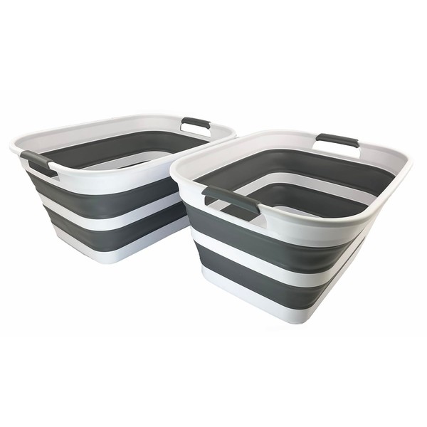 SAMMART 27L (7.1 Gallons) Collapsible Plastic Laundry Basket with Handle-Foldable Pop Up Storage Basket with handle (2, White/Steel Grey)