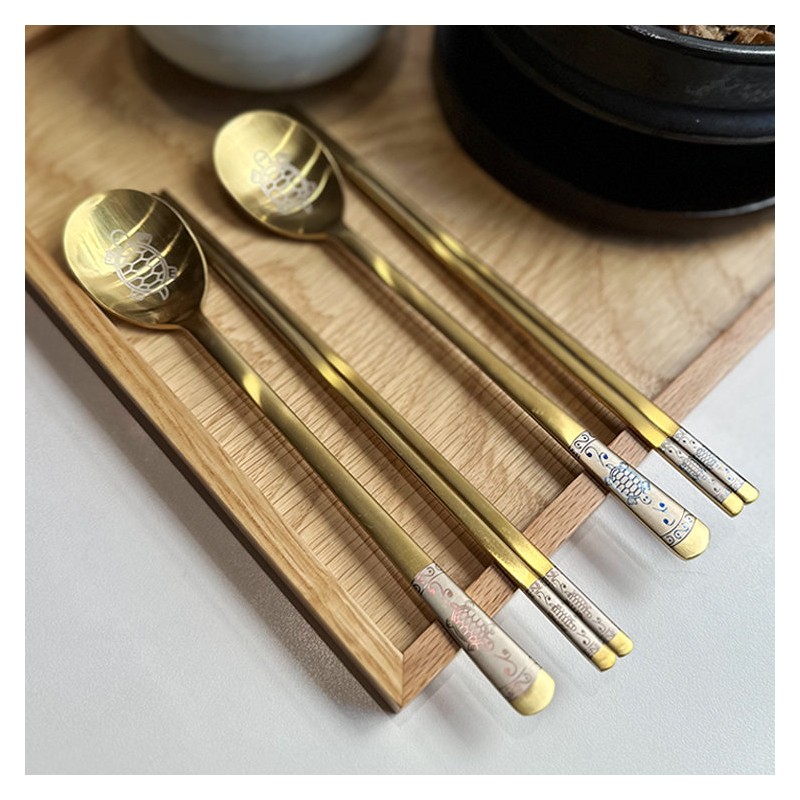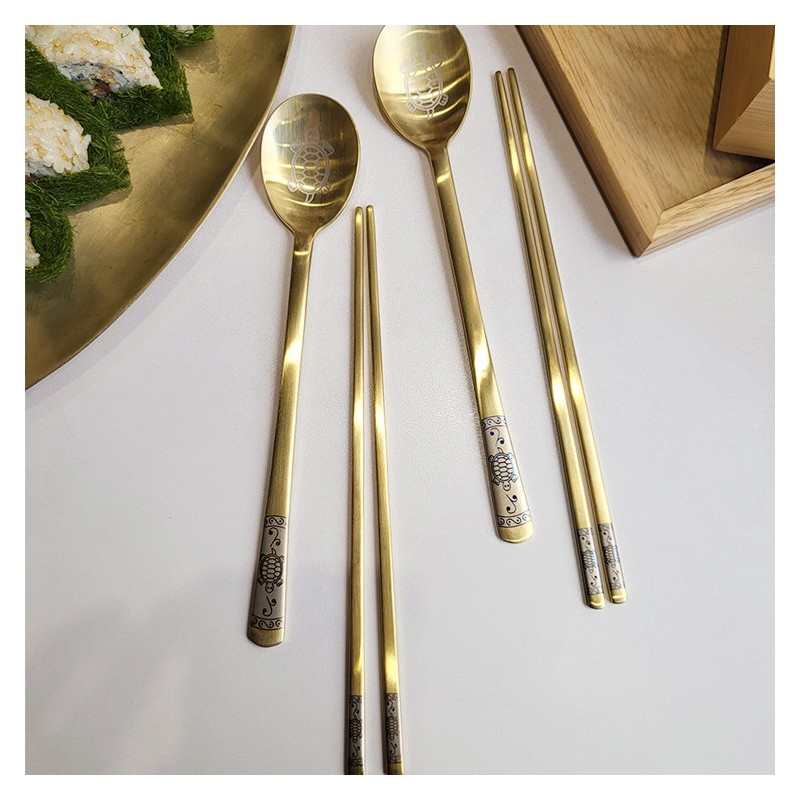 Sammi SMF Leatherback Turtle Blue Red Laser Couple Cutlery Set 4P (Gold) / 삼미 SMF 장수거북 청 홍 레이저 부부 수저세트 4P (골드)