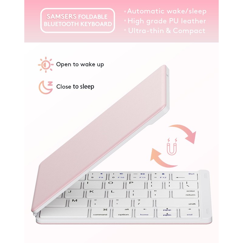 Samsers Samsers Foldable Bluetooth Keyboard - Portable Wireless, with Stand Holder, Rechargeable Full Size Ultra Slim Folding Keyboard for iOS Android Windows Smartphone Tablet and Laptop, White-Pink