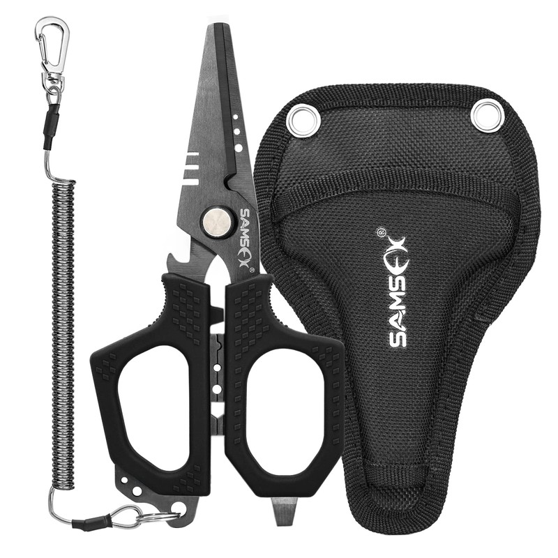 SAMSFX 6.5’’ Fishing Scissors with Non-Slip Grip Handles and Micro Serrated Edges, Shears with Multi-Function and Durable Coating Design (Nylon Sheath, Black Kraton Handle)