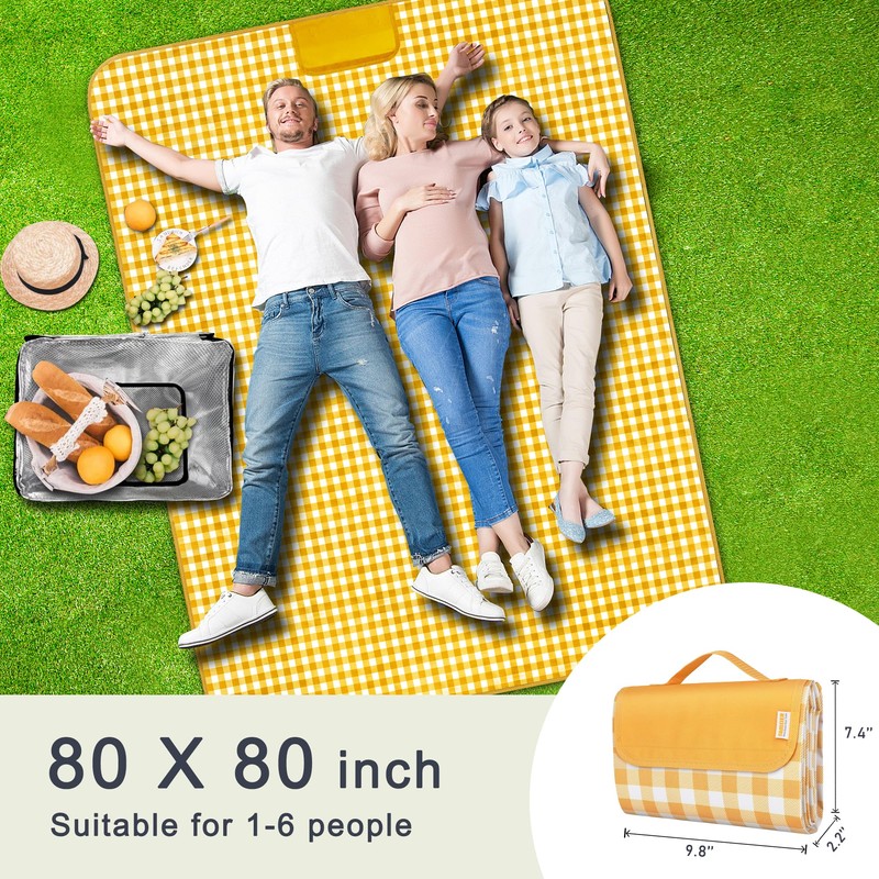 SAMSIER Outdoor Picnic Blankets Waterproof Foldable Sandproof, Extra Large Gingham Cute Picnic Mat Washable Portable for Park Beach Camping Courtyard (Yellow, 80"×80")