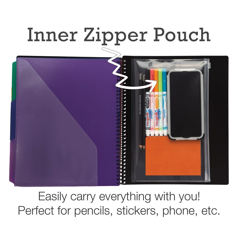 Needing to find a way to organize your papers at home, in the office, or for all your school subjects? Samsill's 24 pocket notebook is the answer you are looking for! This durable file organizer can be used as a coupon organizer, document organizer, portfolio folder, receipt organizer, bill organizer, or for back to school supplies. Color code each divider to help manage your paperwork and create a more organized reference system. With 6 different colored tabs, 12 total folders and 24 pockets this is the paper storage solution of all solutions! Each pocket can comfortably hold 15 to 20 sheets of paper. Which means each individual folder can comfortably hold 30 to 40 sheets of paper. With a grand total storage of 960 sheets (maximum). We don’t recommend over stuffing, but you most certainly can do so. Each tab is customizable without having to use cardboard inserts or sticky white tabs. Write on each tab with a Sharpie marker and when you need to change the subject, simply erase clean! With having the flexibility to hold large amounts of paper, we designed a larger spiral spine to accommodate all your documents. Compared to other competitors on the market having a small spiral spine. Know exactly what is in your folder holder by customizing the front cover. Each document holder has a clear overlay with a non-glare finish on the front cover making your folder easy to customize. Not only can you carry all your papers, but you can also carry extra pens, note cards, stencils, etc. in the attached back pocket. The back pocket is also clear, allowing you to see all the contents inside.