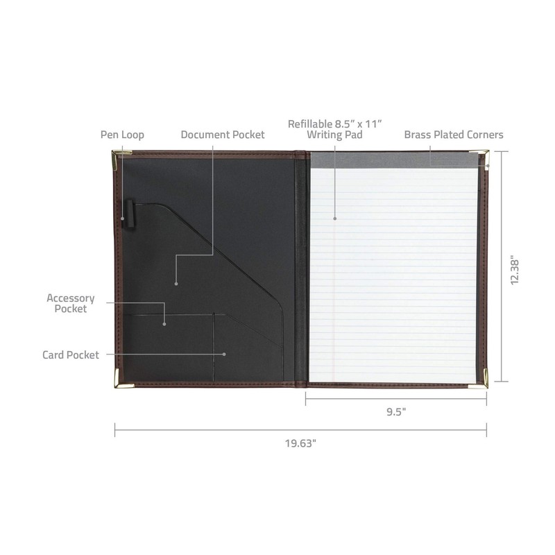 GET ORGANIZED This multi-purpose executive portfolio opens like a book to reveal multiple pockets inside for added convenience. The large document pocket lets you keep loose notes, resumes, business proposals, and other documents in a safe and organized manner. The other inside pockets are made to let you carry your business or credit cards, ID cards, flash drives etc. It also includes a pen loop to carry your favorite pen and make sure you are always ready to take down important information. The 8.5-inch x 11-inch lined writing pad behind the right cover of this business portfolio will let you take quick notes in a meeting, classroom, or any other place where you need to jot down important information right away.