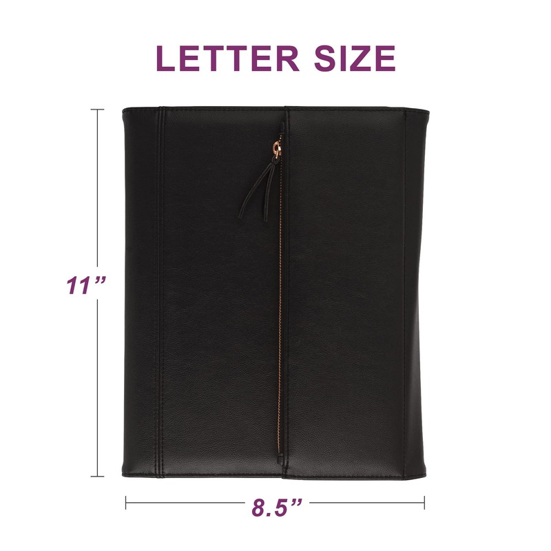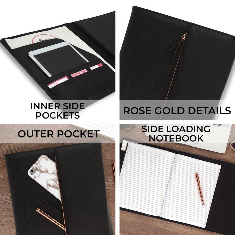 - Premium Cover: This faux-leather padfolio perfectly replicates the rich look and feel of leather; Perfect for all your professional needs, it also features premium stitching and a stylish rose-gold zipper
