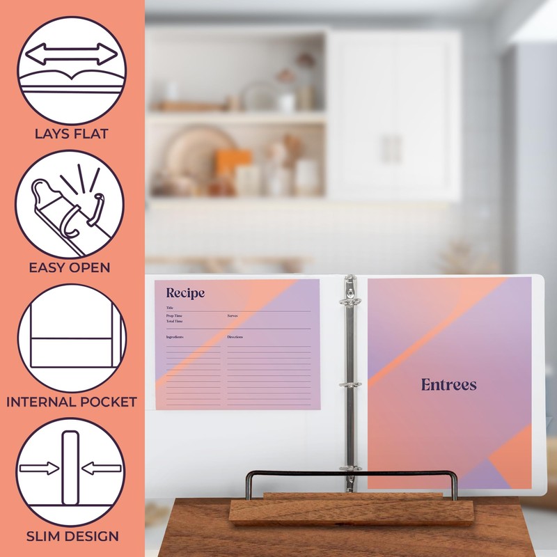 • All-In-One: Our recipe book holds all your favorite family recipes. Replace your old recipe box with this stylish, slim all-in-one recipe kit. Interior pocket makes for extra storage. Angle D-Rings makes adding more recipes easy. Make a great gift for your favorite cook