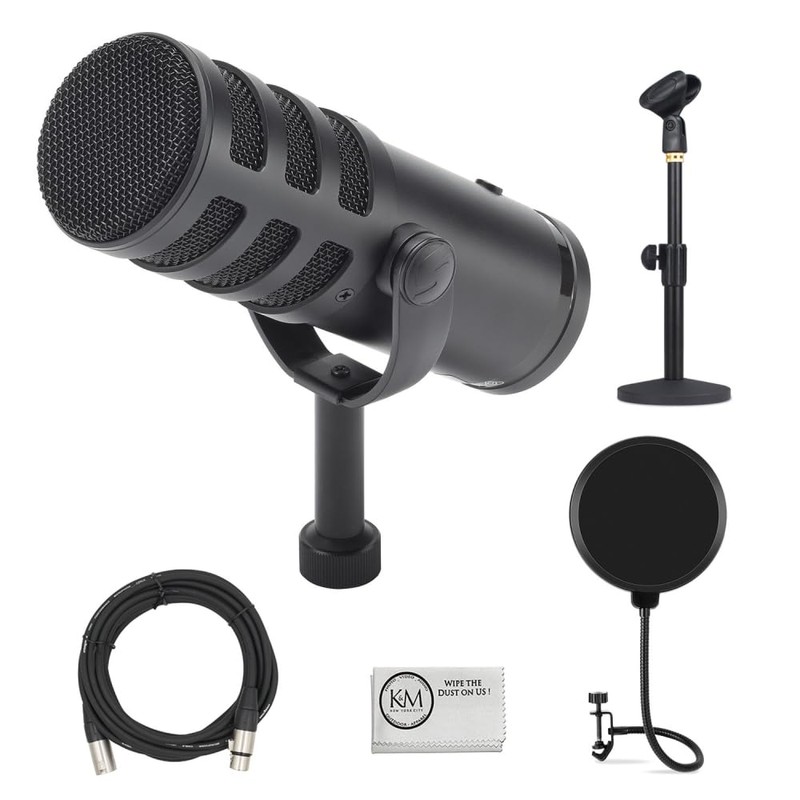 - [1] Samson Q9U XLR/USB Dynamic Broadcast Microphone + [2] Mic Table Stand + [3] Wind Screen Pop Filter + [4] 20-Feet XLR Microphone Cable + [5] Microfiber Cleaning Cloth