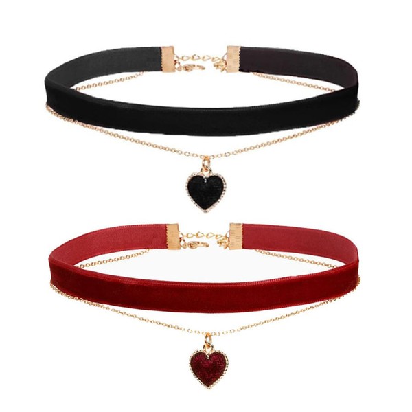 Samt Choker Halsband - 2 Pack klassische Samt Herz Choker Halsketten Set, Schwarz & Rot Gothic Chokers mit verstellbarer Kette, Herz Anhänger Halsketten für Frauen
