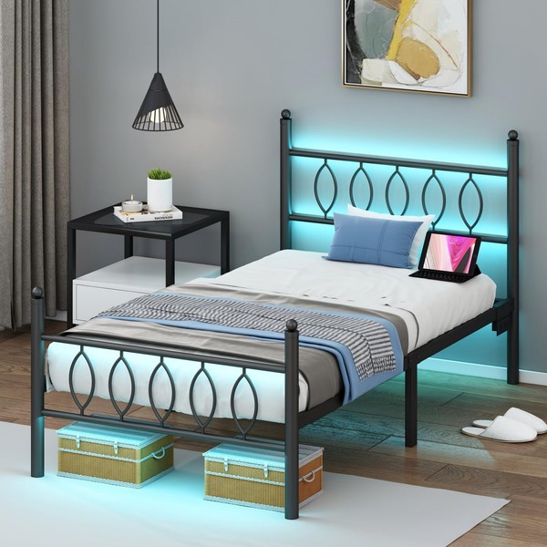 Samurbex Twin Size Bed Frame with Headboard,Black Metal Platform Bed Frame Twin Size with Charging Station & LED Lights,12-Inch Under Bed Storage,No Box Spring Needed,Noise Free,Easy to Assemble