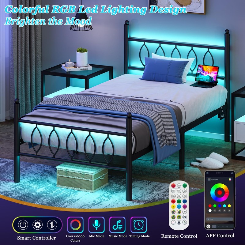 - 【Smart RGB LED Light】:The metal twin size bed frames is equipped with an RGB LED light strip that can be controlled by remote control or mobile phone APP to explore more than 60,000 colors.You can adjust the black twin size bed frames for kids light color,mode,brightness and timer settings according to your personal preferences,let the music accompany the light,and create a romantic and beautiful atmosphere for your bedroom.