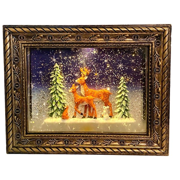 This musical lighted reindeer in the woods frame plays 8 assorted songs. Can set to light up with music on or off. Frame is 9.5 inches wide and 7.5 inches tall. Water spins with sparkling glitter. Beautiful addition to any Christmas decoration collection.