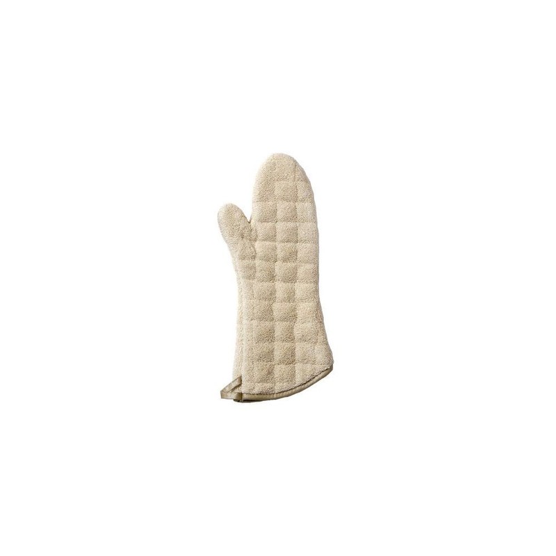 This terry cloth oven mitt is extra heavyweight to provide lasting durability in a commercial environment. This protective glove is made of 100% cotton for optimum comfort throughout long hours. This terry cloth oven mitt protects hands from temperatures as high as 500°F. The baking glove comes with a hanging loop for easy storage and a brown wrist piping loop for a clean edge. This terry cloth oven mitt is ambidextrous so you can wear it on either hand.