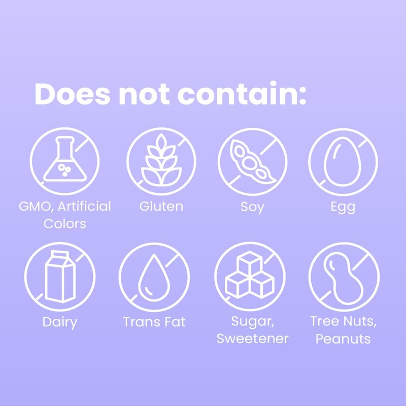 - THIS SUPPLEMENT EXCLUDES: GMO, Artificial Colors, Gluten, Soy, Egg, Dairy, Trans Fat, Sugar, Sweeteners, Tree Nuts, and Peanuts.