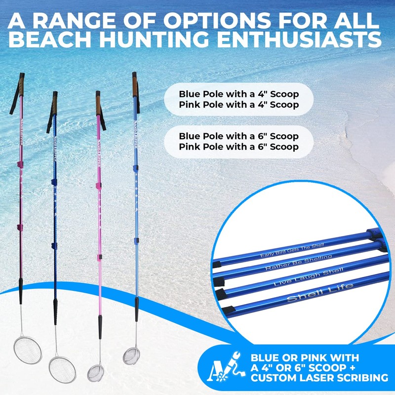 - Sizes & Styles for All Treasure Hunters: Our sea shell digger tool is available in Blue or Pink with a 4" or 6" scooper basket; We also provide Custom Laser Scribing on all sizes and styles if you want to give your seashell catcher pole a more personalized look (this is popular when giving a Sand Dipper as a gift)