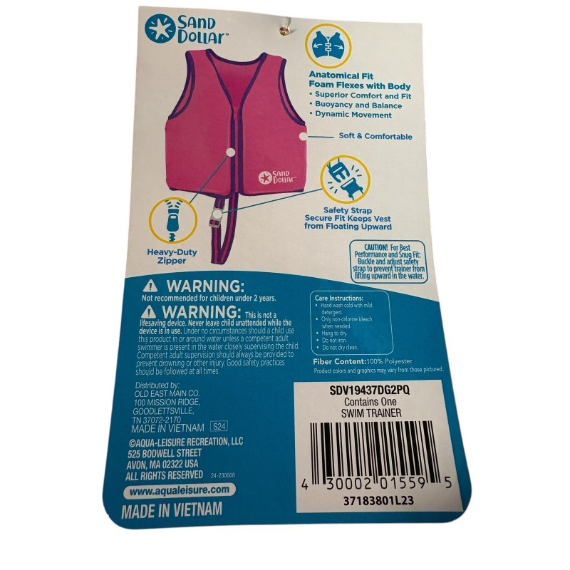 The Sand Dollar Girls Pink Swim Trainer Vest is a stylish and functional training aid designed for young swimmers ages 2-4 years. With a maximum weight capacity of 33 lbs, this adjustable vest provides the necessary support and stability for children learning to swim. Made by Sand Dollar, a trusted brand in water sports, this vest is manufactured in Vietnam to ensure quality and durability. Whether used for swimming lessons or just for fun, this swim trainer vest is a great tool for helping children develop their swimming skills.