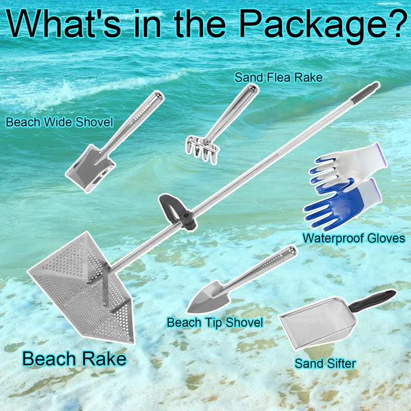 Buy this product, you can get a sand flea rake, a sand sifter, a beach flat shovel, a beach pointed shovel, a beach rake, a pair of gloves, enough beach tools to cope with a variety of beach environments, to help you better treasure hunting on the beach