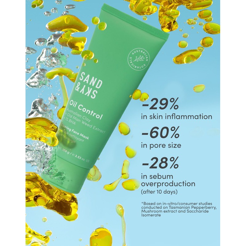 Sand & Sky Oil Control - Clearing Face Mask 100g is a purifying mask that targets the three main causes of imperfections to reveal smooth, clear, glowing skin.