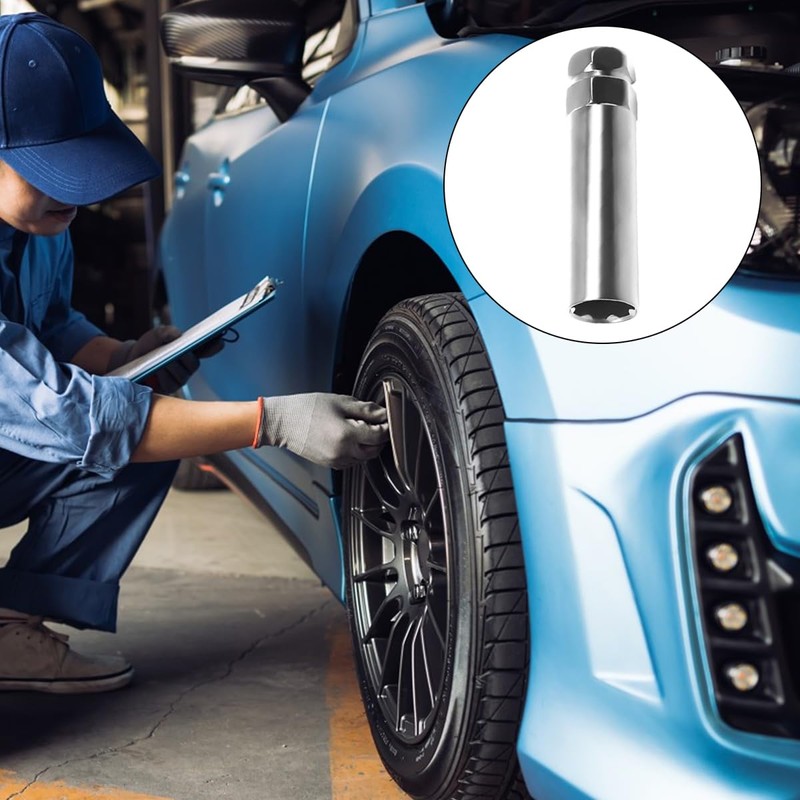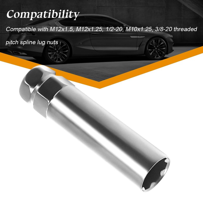 - Universal Vehicle Compatibility: This six slot lug nut socket measures 3.46 x 0.79 inches with a 0.67 inch inside diameter and is compatible with M12x1.5, M12x1.25, 1/2- 20, M10x1.25, 3/8 - 20 threaded pitch splined lug nuts and 19mm (3/4")and 21mm (13/16") hex socket wrench for a wide variety of sedans, SUV, light trucks, and commercial vehicles for roadside emergencies, tire changes, brake service, and wheel customization, etc.